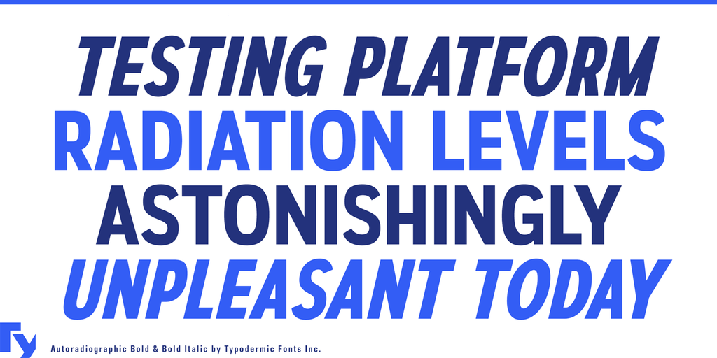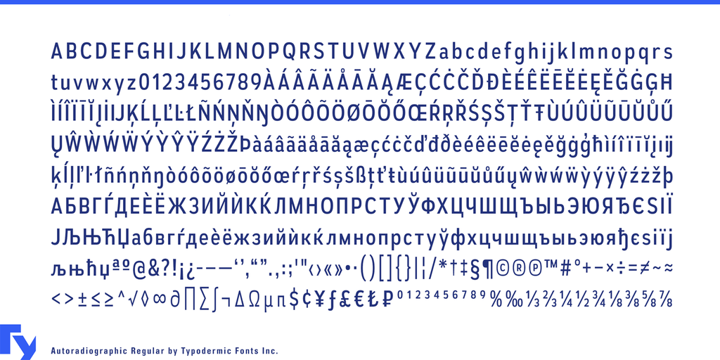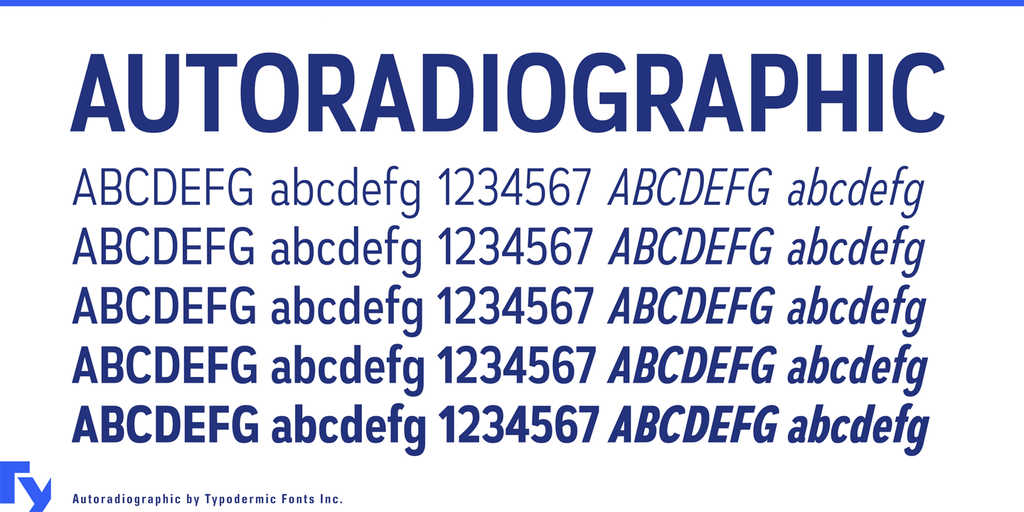 Autoradiographic is a sans-serif typeface in 5 weights, inspired mid-twentieth century hand-painted warning signs. Inflammable! Keep out! Post-war low waistlines were fashionable in those years, but strict waistline alignment was not. This type of informational lettering was intended to be clean and technical but some personality shone through. Autoradiographic includes Cyrillic, mathematical symbols, fractions and the latest currency symbols. Italics are narrow and loosely spaced for extra emphasis. The desktop licence for the Regular and Italic styles is free.