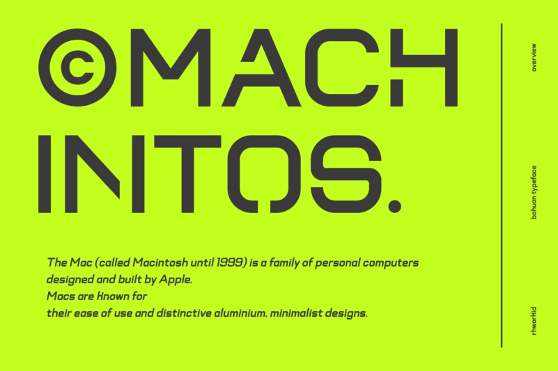 Bohuan Font is a variable modern sans serif display typeface created by Rhwork id. Its inspired by a mecha cyberpunk sub genre. The modern and unique characteristics makes it suitable for attention grabbing design projects such as a engineering, technology, cyber media, army stuff, headlines, posters, social media displays and editorials.