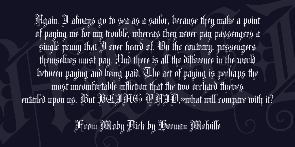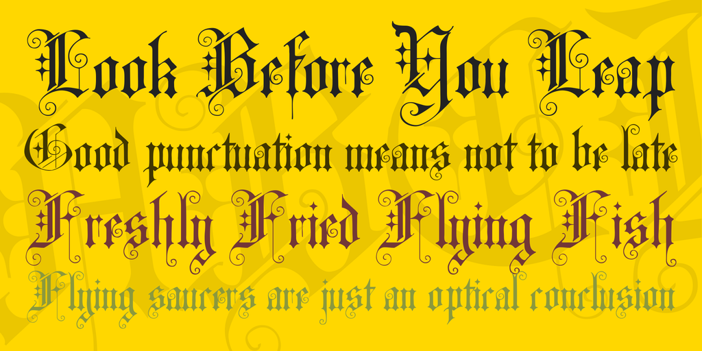CAT Altgotisch is another highly ornate font of the late 19th century. The name Altgotisch (old gothic) is almost misleading because it refers to a significantly more stringent form, however this font was built upon old gothic writings.