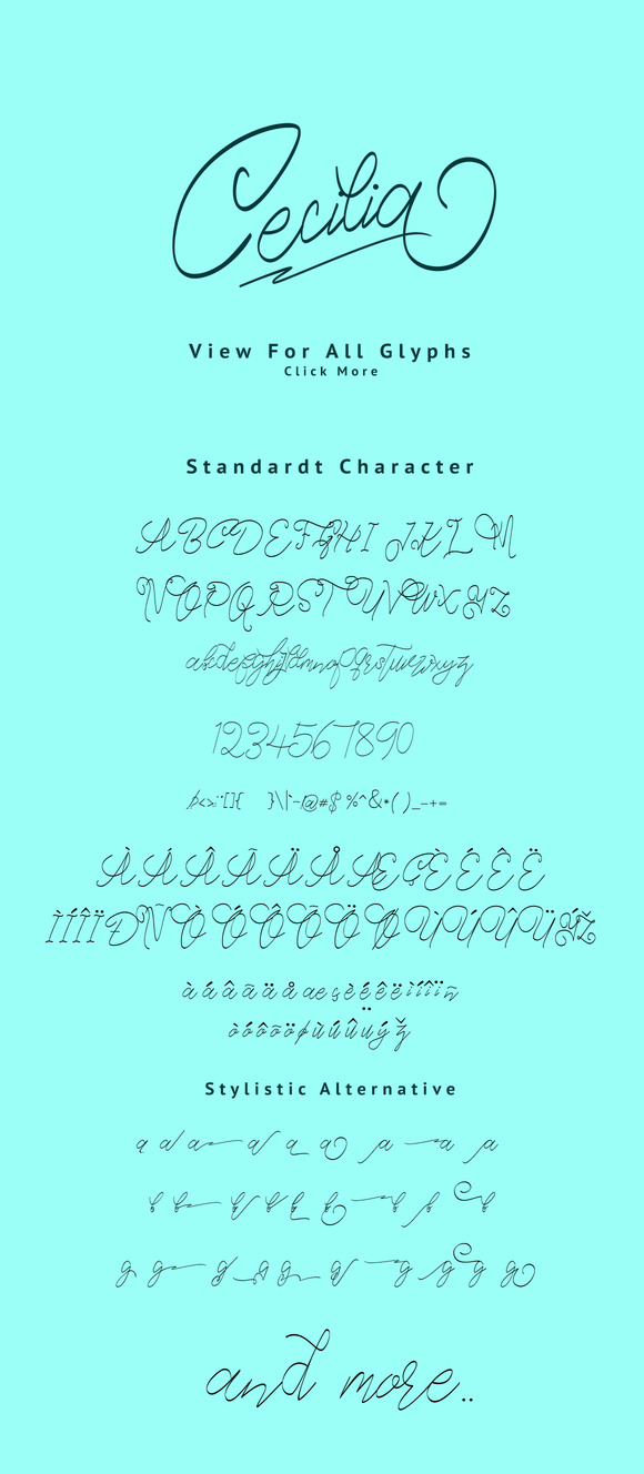 Cecilia Script features 394 glyphs and 224 alternate characters. including initial and terminal letters, alternates, ligatures and multiple language support.
