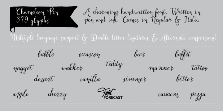 Chameleon consists of 16 fonts based on 3 completely different designs. Different but specially designed to complement each other. Together they form a well-balanced design kit suitable for many different projects, e.g. invites, menus, magazines, brochures, packaging, etc.