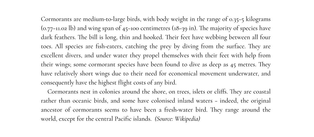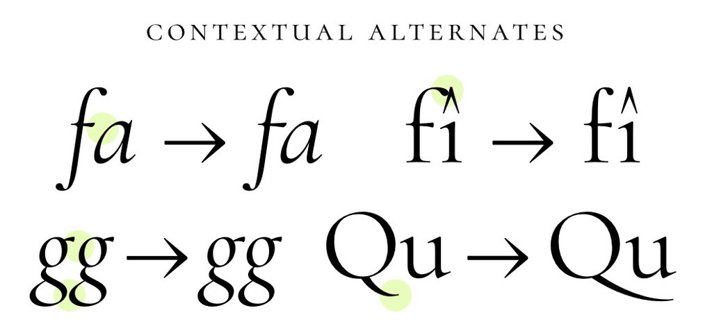 Cormorant is a native 21st-century typeface making ample use of OpenType technology. Some OpenType features are applied automatically while you type, subtly improving the flow of the text. This includes kerning, standard ligatures, and contextual alternates. Other features are intended to be activated manually by the user, such as discretionary ligatures, stylistic alternates, small capitals, and alternate figure sets. Note that not all text processors, design applications, or browsers support all OpenType features, and some applications may require the user to switch these features on manually (such as Microsoft Office).