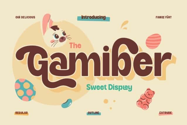 Gamiber Font is a bold retro sans display typeface created by Burntilldead with a striking extruded style. It’s perfect for cheerful and eye-catching design projects. Gamiber comes in three styles: Regular, Outline, and Extrude, making it super easy to mix and match for your designs. Whether you’re working on branding, packaging, posters, or social media, this font is a great choice—especially for food-related themes, nostalgic designs, and anything kid-friendly!