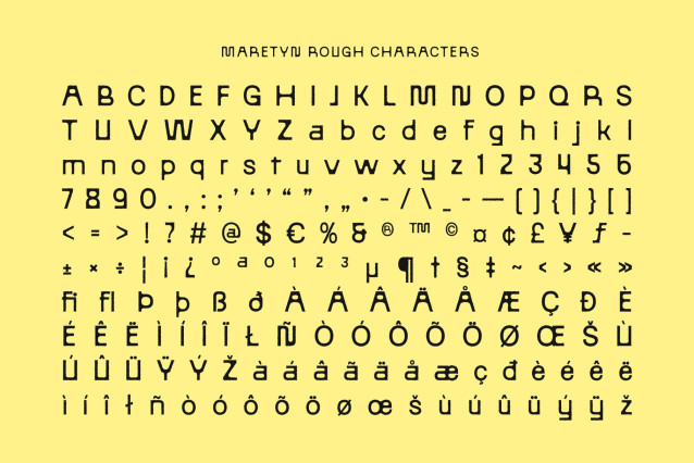 Maretyn Rough Font is a modern sans-serif font that artfully merges grotesque and geometric design principles. With balanced proportions, clean construction, and a structured aesthetic, it delivers a solid and contemporary appearance ideal for design projects that demand both functionality and style.