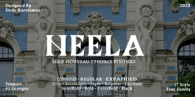 Neela Serif Nouveau Font is an Art Nouveau serif typeface designed for a variety of design needs. With 27 font families consisting of thin, extralight, light, regular, medium, semibold, bold, extrabold, and black, as well as condensed and expanded types, Neela can be used for various sizes and design needs. Neela is characterized by sleek and elegant letters, with typical Art Nouveau elements, such as subtle and elegant decorative flourishes. This font is suitable for various design needs, such as: Book covers, wine labels, wedding invitations, exhibitions, packaging, merchandise, event billboards, posters and many others. Neela also supports 65 Latin alphabet languages, so it can be used for various design needs throughout the world. Characteristics The letters are sleek and elegant Distinctive Art Nouveau elements Suitable for a variety of design needs Neela is the perfect typeface for designers looking for an elegant and versatile Art Nouveau serif typeface. This font can be used for various design needs, from book design, labels, invitations, to graphic design.