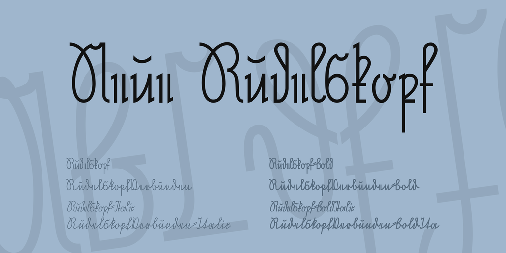 Translation of the original German description: Some years ago I had drawn the Rudelskopf. That font was actually nothing more than an experiment and not meant seriously. Hence, Mr. Thorwald Poschenrieder has contacted me to ask if I could make the font more legible and so I fine-tuned this font with his help. In the end we created something entirely new, a kind of block letters, but with the forms of “German Script”, which is legible to someone who can read German kurrent. The more time I spent with this font and the glyphs, the more I realized that this font is very good to learn “Sütterlin”, as it does not include the typical long jagged strokes, and one can concentrate more on the pure letterforms. Therefore, I have supplemented this font by a second variant with slightly extended strokes, so as to facilitate a transition to a connected kurrent. A further expansion of the family with forms of blackletter and gothic script but also in the direction of the latin script will follow in the future, when I find the time for it.