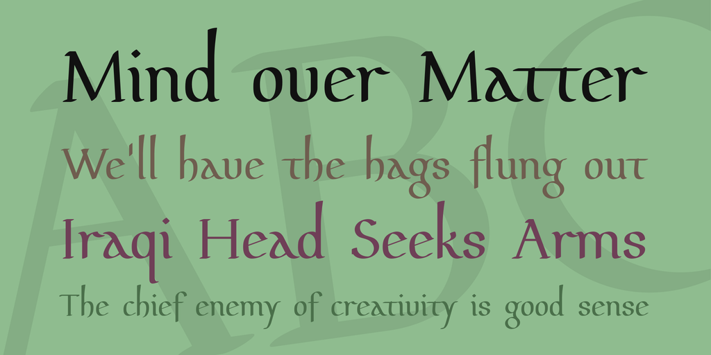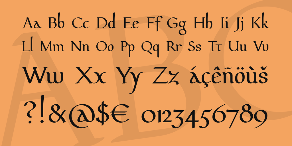 Pfeffer Mediæval contains OpenType features for historical text layout, insular script and Gothic alphabet as well as for small capitals and particularly large capitals.