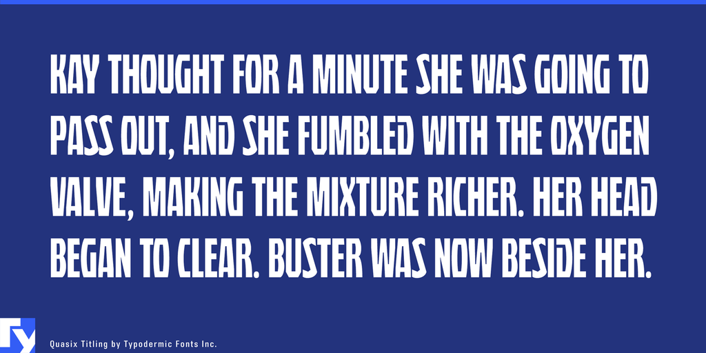 Quasix is a compact, industrial headliner. Like the inside of a machine, it appears functional, even though the specific purpose of each individual part may not be understood by the viewer. Often, a designer needs to convey the idea of engineered devices without resorting to a stereotypical techno typeface or something more concrete like gears and bolts. Unlike many display fonts in the industrial category, Quasix isn’t tied to any particular era, making it suitable for retro, contemporary or futuristic themes. If you’d like lowercase letter, check out the regular Quasix font.