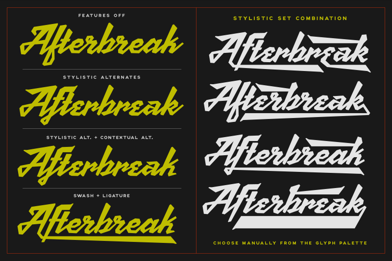 This is a stripped demo version, free for personal use. The full commercial version available at Creative Market has over 500 glyphs. The full Scriptonite is loaded with Opentype features: Stylistic alternates, swashes, contextual alternates, kerning and ligatures. So many alternates can be played. At least one letter has 3-8 alternate characters. So try this font and see what you can get.