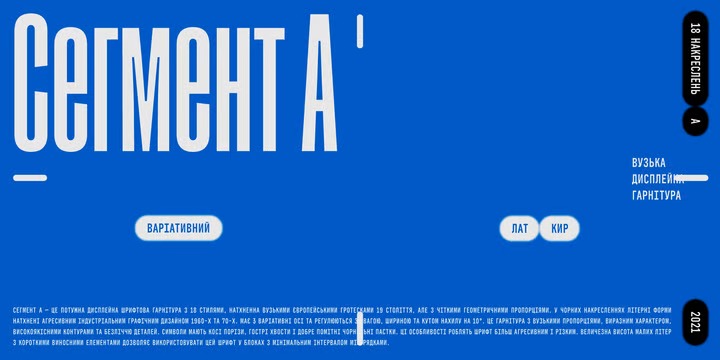 Segment A Type Font is a bold Condensed sans serif font that features lowercase letters that reach the cap height. In Black weights, the letterforms are inspired by the aggressive industrial graphic design of the 1960s and 70s. Both have 3 axes and are adjustable in weight, width and 10˚ italic. It is a typeface with narrow proportions, distinctive character, high-quality outline and lots of details. Characters have oblique cuts, sharp tails and highly visible ink traps. All this makes the font more aggressive and edgy. The huge x-height with short ascenders and descenders allows this typeface to be used in blocks with minimal line spacing.