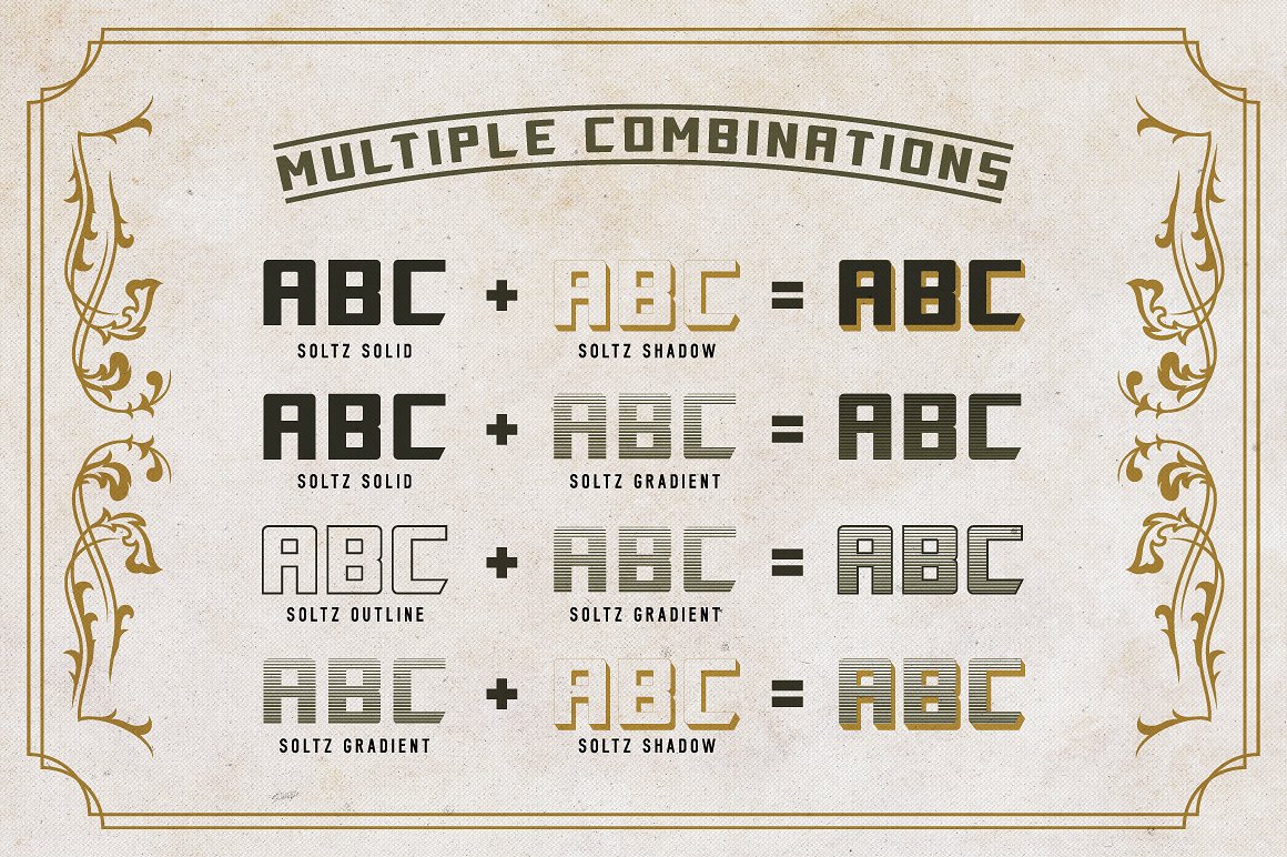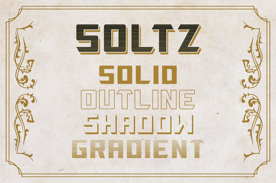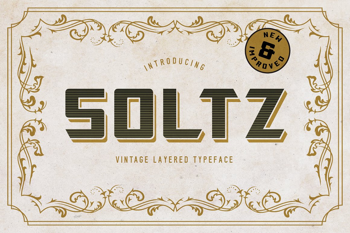 Introducing Soltz Font. It is designed by Von Type Co, this is a premium font, are sold on creativemarket, but it was great, it is free today for download. Soltz Vintage Layered Typeface – a layered typeface inspired by vintage hand painted sign advertisements found in Atlantic City, NJ. Featuring 4 stackable styles that easily combine to make a wide variety of typography effects. From Logos, T-shirts, Retro Posters, Prints, Cards, or Package designing, Soltz is the perfect fit for a touch of vintage style to any project.