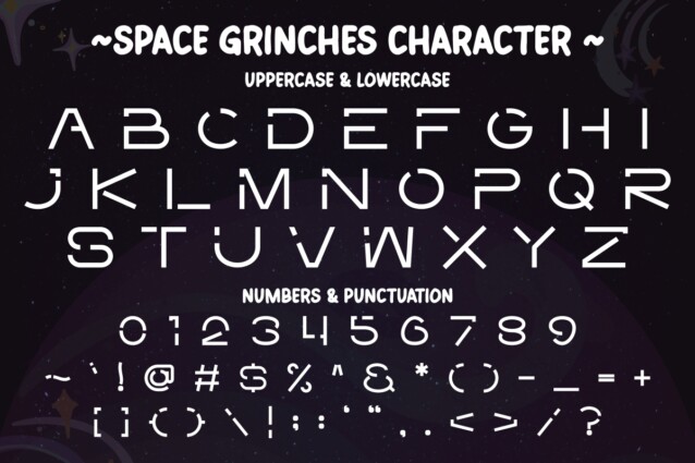 Space Grinches Font is a modernity cosmic font with futuristic style. Space Grinches is perfect for creating sleek and trendy scifi designs, from space-themed branding to futuristic digital interfaces.