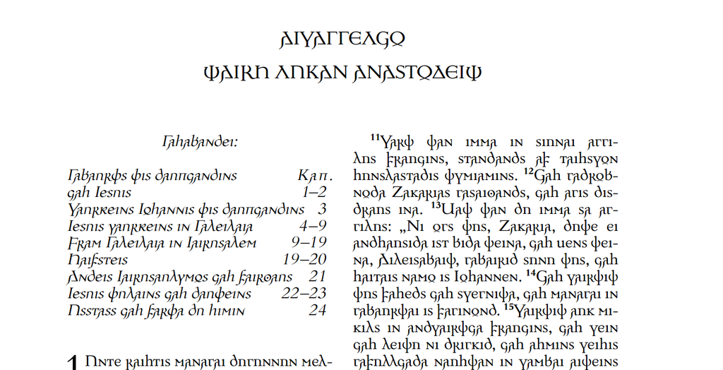 To satisfy today’s requirements, this font contains uppercase- as well as lowercase letters, although there were only capital letters in historic Gothic. The minuscules of this font have been derived from those majuscules. Doing so wasn’t particularly difficult, as the Codex Argenteus’ uncial script already shows attempts of ascenders and descenders. The relation between Latin and Greek upper- and lowercase letters gave me further aid.