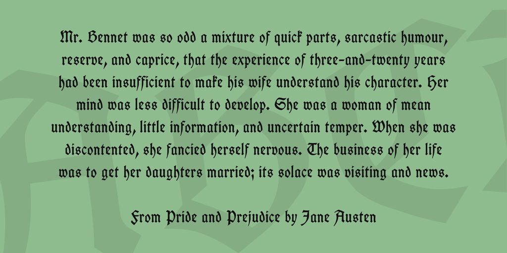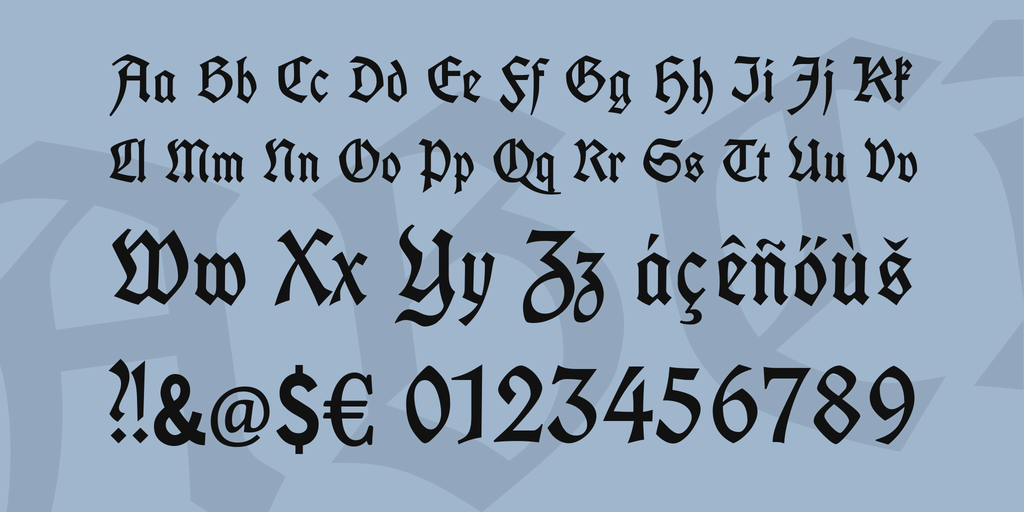 UnifrakturCook is a blackletter font. It is based on Peter Wiegel’s font Koch Fette Deutsche Schrift which is in turn based on a 1910 typeface by Rudolf Koch. While the glyph design of Peter Wiegel’s font has hardly been changed at all, UnifrakturCook uses smart font technologies for displaying the font’s ligatures (OpenType, Apple Advanced Typography and SIL Graphite). An experimental feature is the distinction of good blackletter typography between required ligatures ‹ch, ck, ſt, tz› that must be kept when letterspacing is increased, and regular ligatures (for instance, ‹fi, fl›) that are broken up when letterspacing is increased.