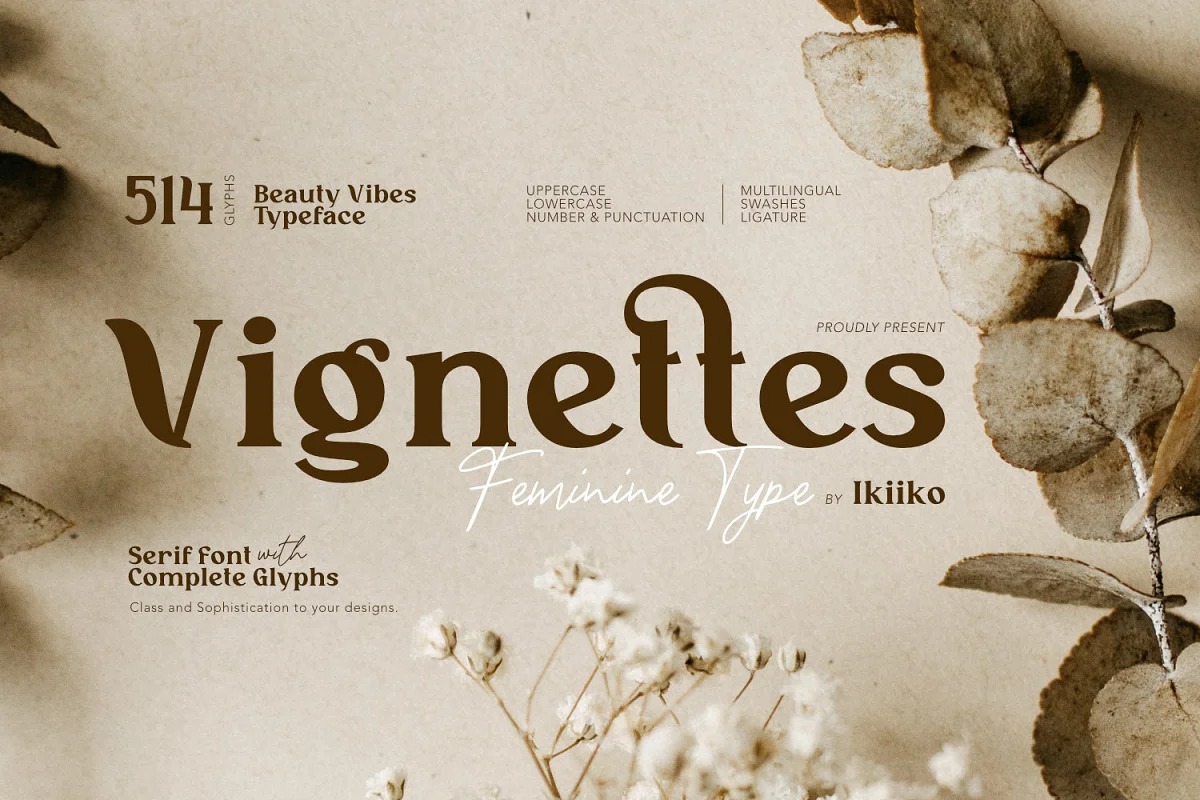 Vignettes Serif Font is beauty serif display typeface created by ikiiko with many unique decorative features. You can choose the type of decoration that suits what you need. Vignettes also have bold font characters with elegant and feminine shapes. This typeface is perfect for an elegant logo, branding, wedding, invitation, layout magazine, home & decor layout, beauty product, packaging product, quotes, or simply as a stylish text overlay to any background image.